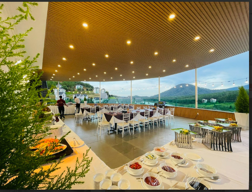 • Tối (16:30): Nghỉ ngơi rồi tham gia gala dinner Đà Lạt tại nhà hàng resort – buffet BBQ (chả cá bách hoa, tôm sú nướng, salad bar, lẩu, tráng miệng – 150.000 VNĐ/khách). Không gian sang trọng với sân khấu, micro, TV, và backdrop 2.5m x 4m miễn phí. Nâng cấp VIP âm thanh ánh sáng (+6.000.000 VNĐ/4 tiếng) cho sự kiện chuyên nghiệp. Kết thúc lúc 21:00.